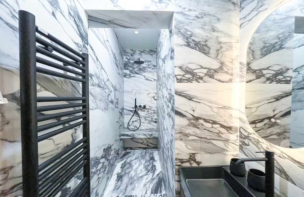 Dall'altro lato del corridoio si sviluppa la zona notte, con tre camere da letto e tre bagni concepiti come autentiche oasi di benessere, sono dotati di doppi lavabi, ampie specchiere e docce multifunzione, affacciate su un lungo balcone che guarda verso l'interno del palazzo.