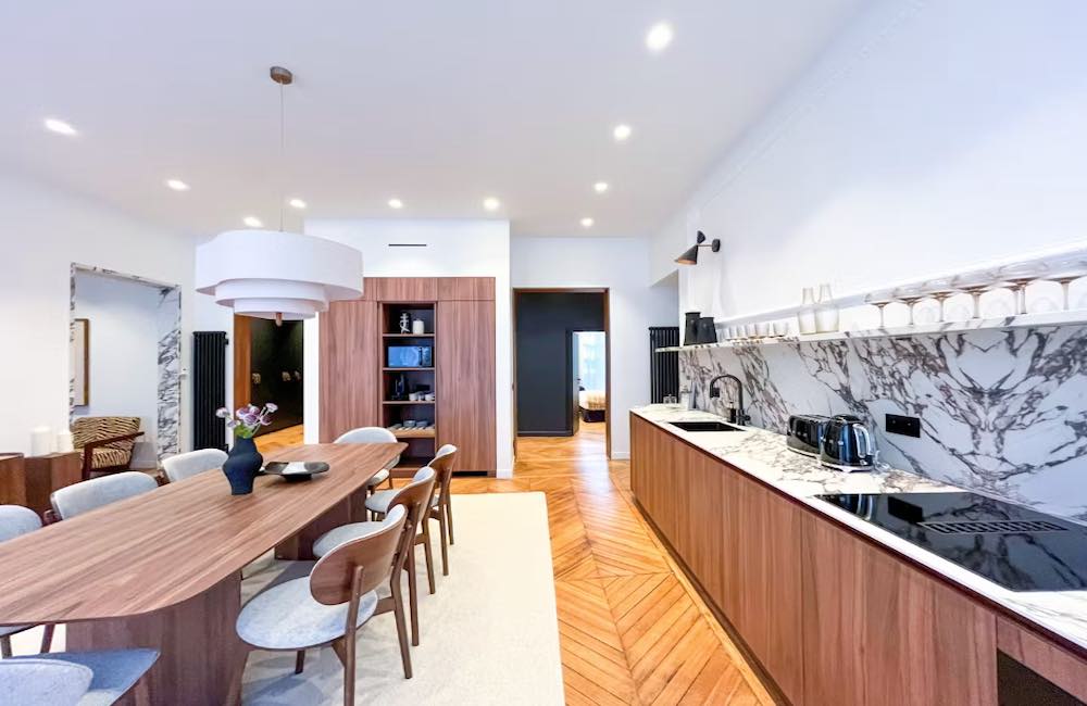 La superficie di 250 mq si distingue per la sua straordinaria zona giorno, luminosa ed elegante, che comprende un ampio soggiorno con cucina a vista moderna ed accessoriata, con un grande tavolo da pranzo perfetto per la quotidianità. Il pavimento in parquet percorre ogni ambiente e si accompagna a dettagli di grande pregio.