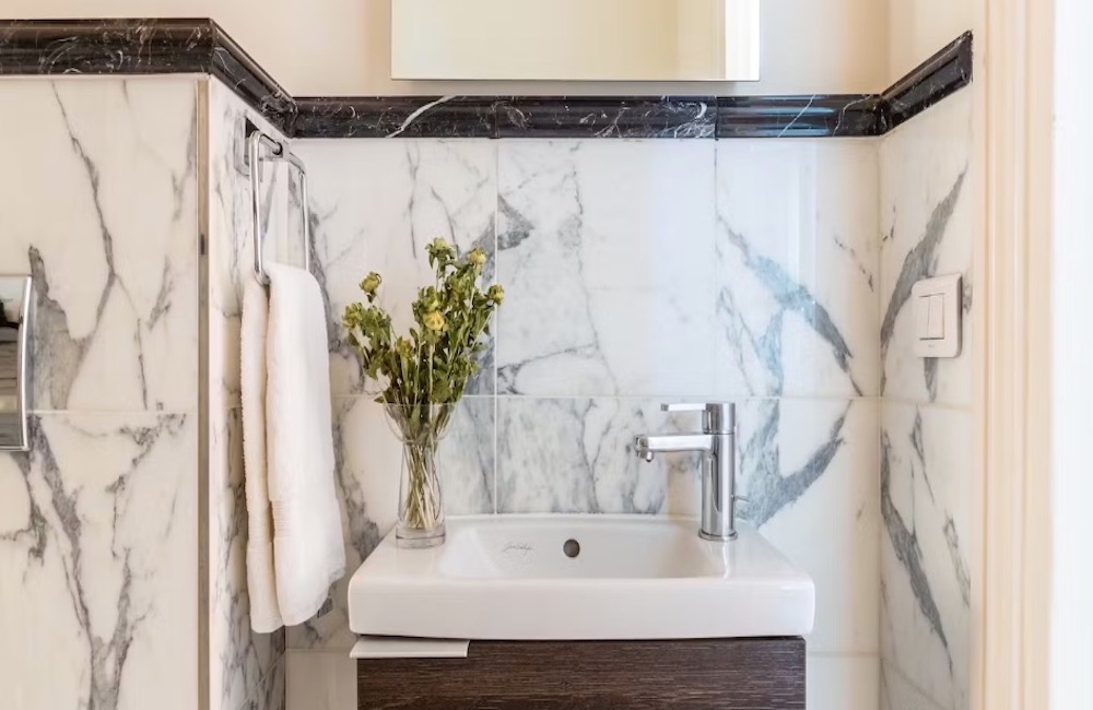 L'ingresso dell'appartamento si apre su un raffinato ingresso living su un ambiente luminoso ed elegante che introduce al grande salone con camino, zona pranzo e cucina, collegati visivamente ma studiati per mantenere una discreta separazione funzionale, due suite padronali con cabina armadio e una sala da bagno di grande impatto scenico.